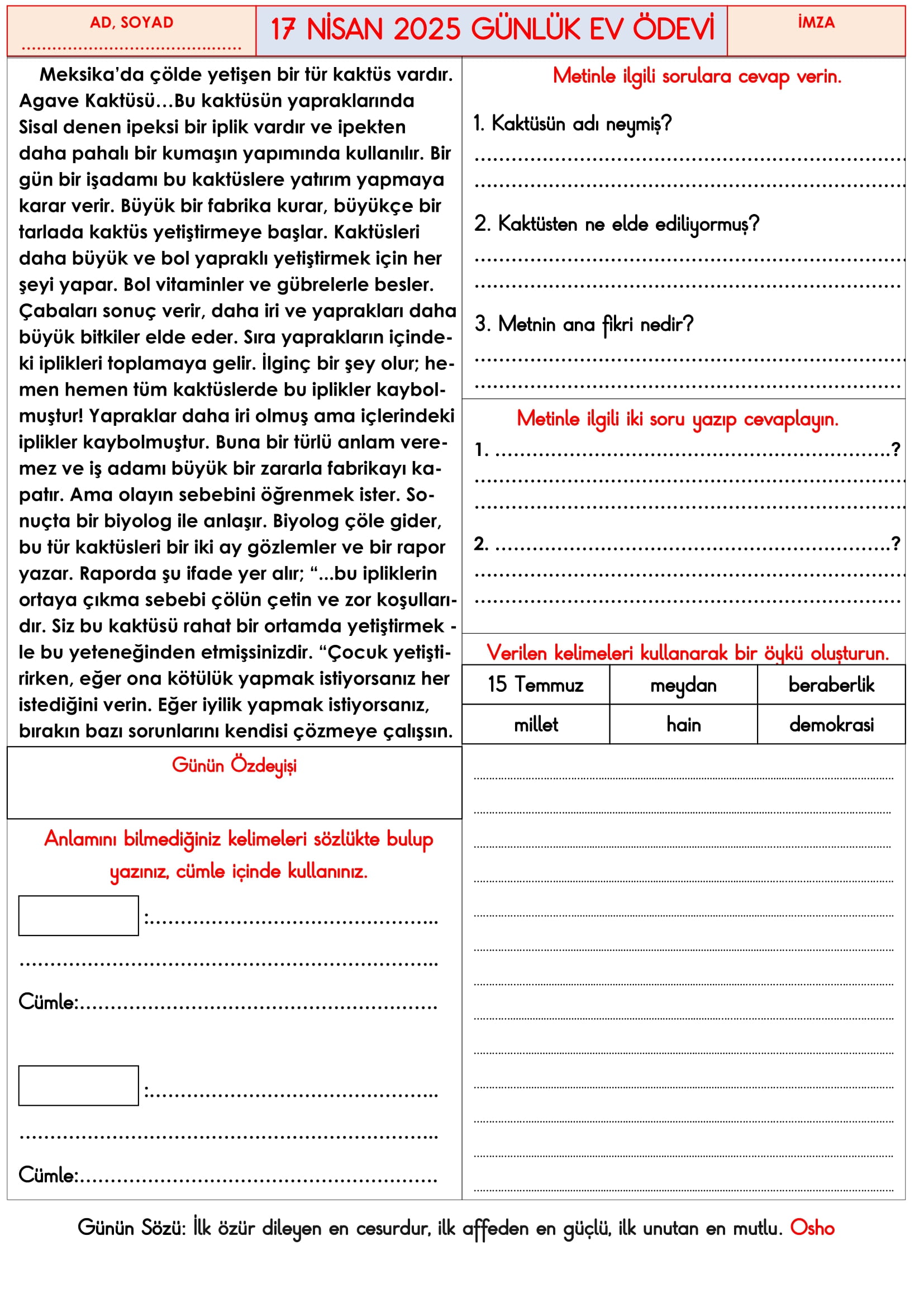 3.Sınıf 17 Nisan 2025 Günlük Ev Ödevi