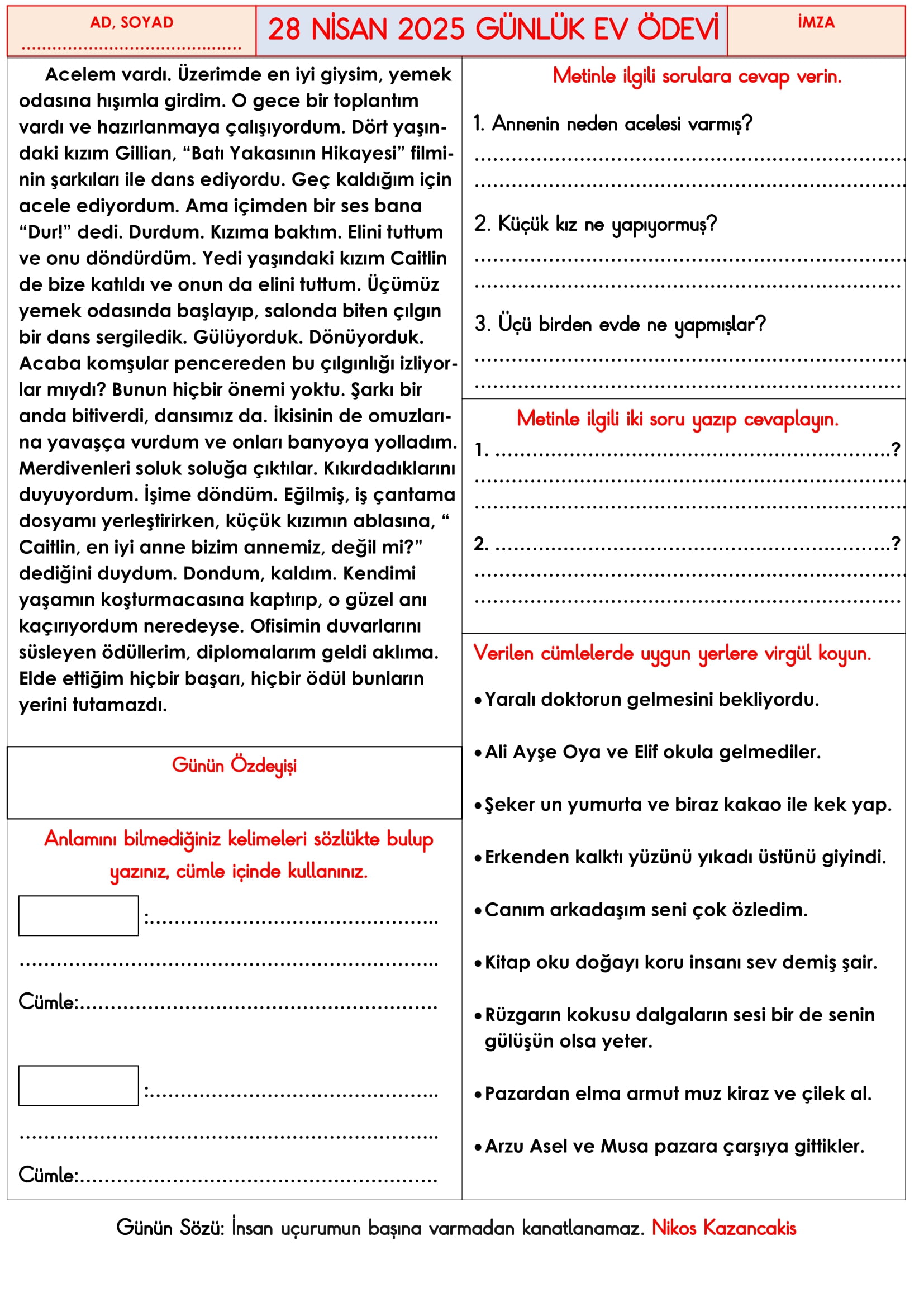3.Sınıf 28 Nisan 2025 Günlük Ev Ödevi