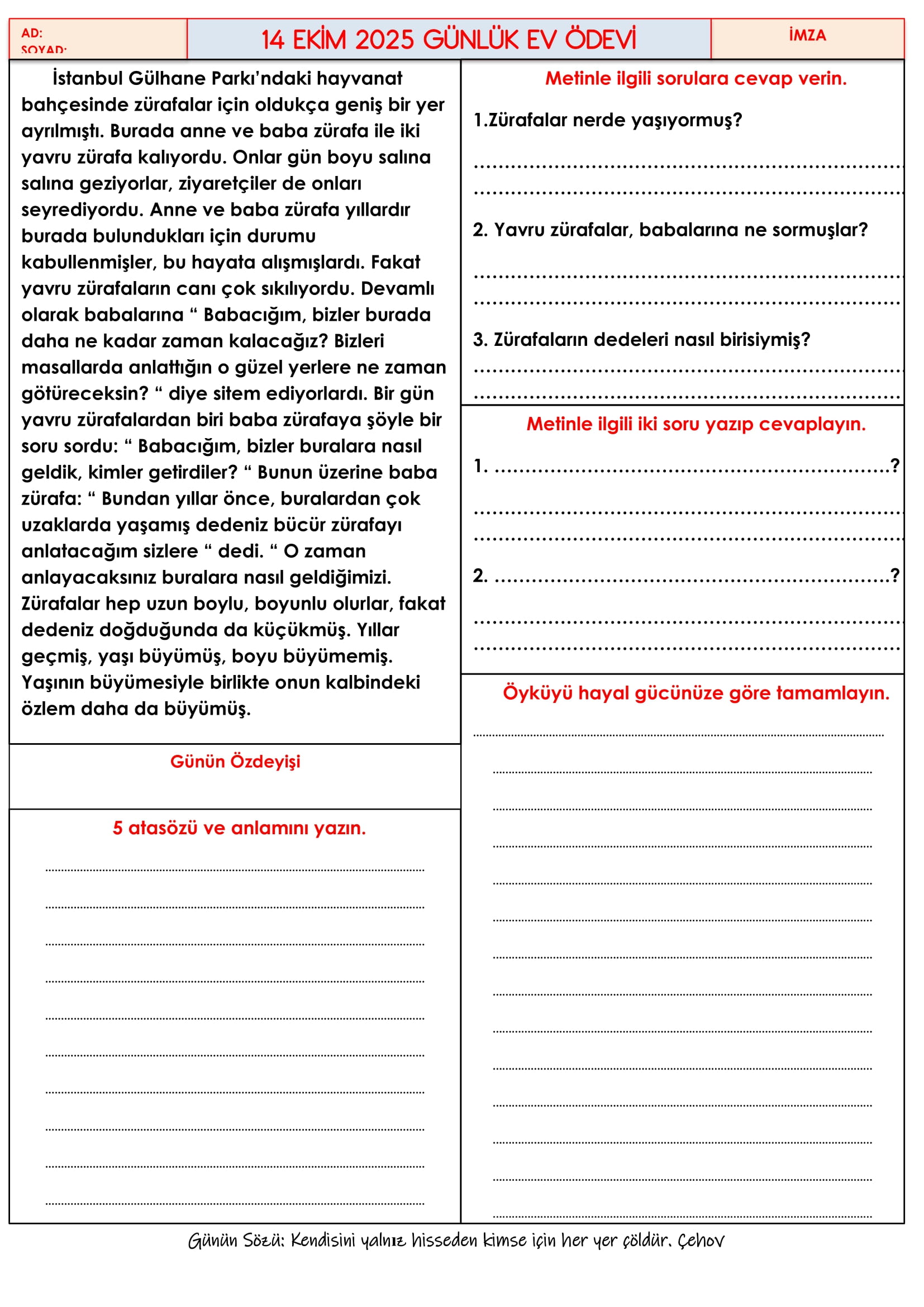 4.Sınıf - 14 Ekim 2025 Günlük Ev Ödevleri