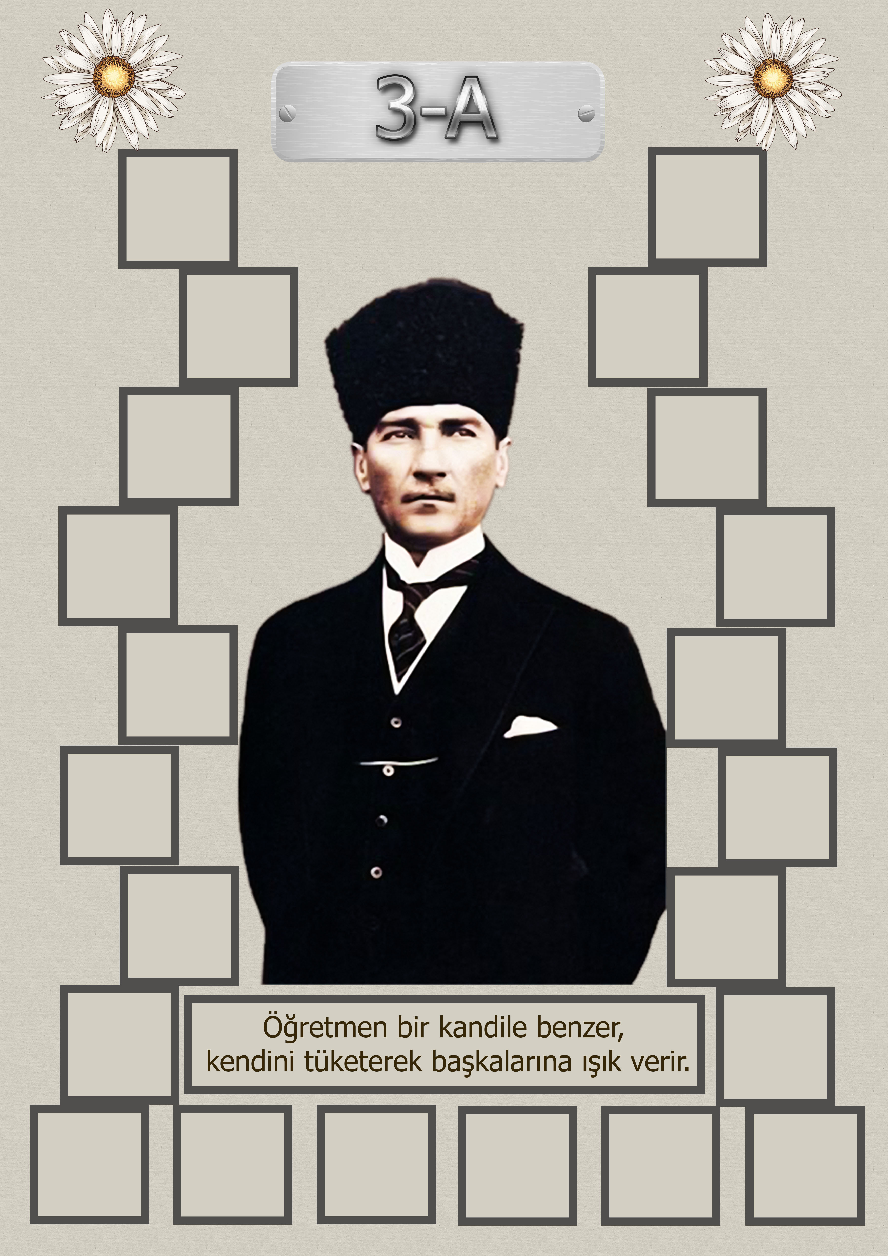 Model 15, 3A şubesi için Atatürk temalı, fotoğraf eklemeli kapı süslemesi - 22 öğrenciliktir. A3 boyutundaki yüksek çözünürlük afiş için dosyayı indiriniz. Kendi öğrenci sayınıza uygun bu model kapı süsü sitemizde yoksa ayrıca istek yapabilirsiniz.