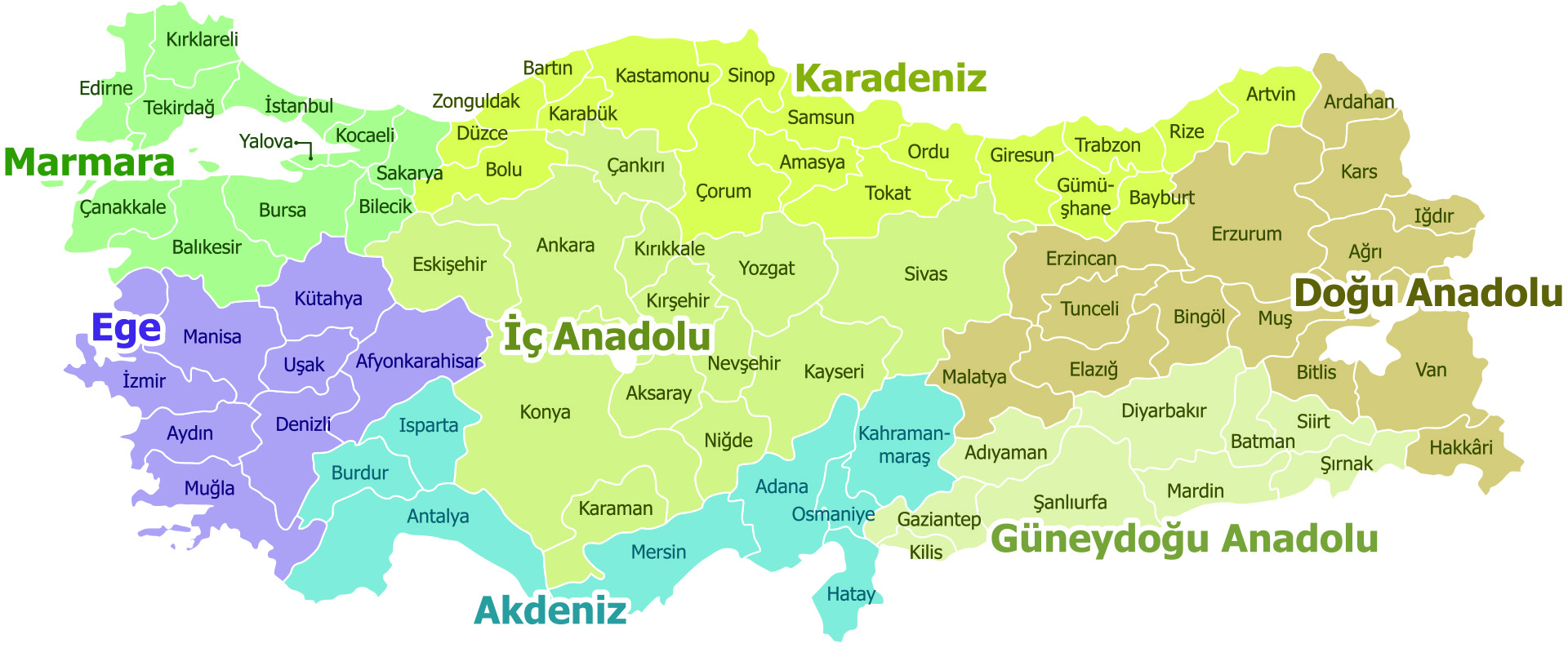 İlleri ve Bölgeleri Gösteren Türkiye Haritası