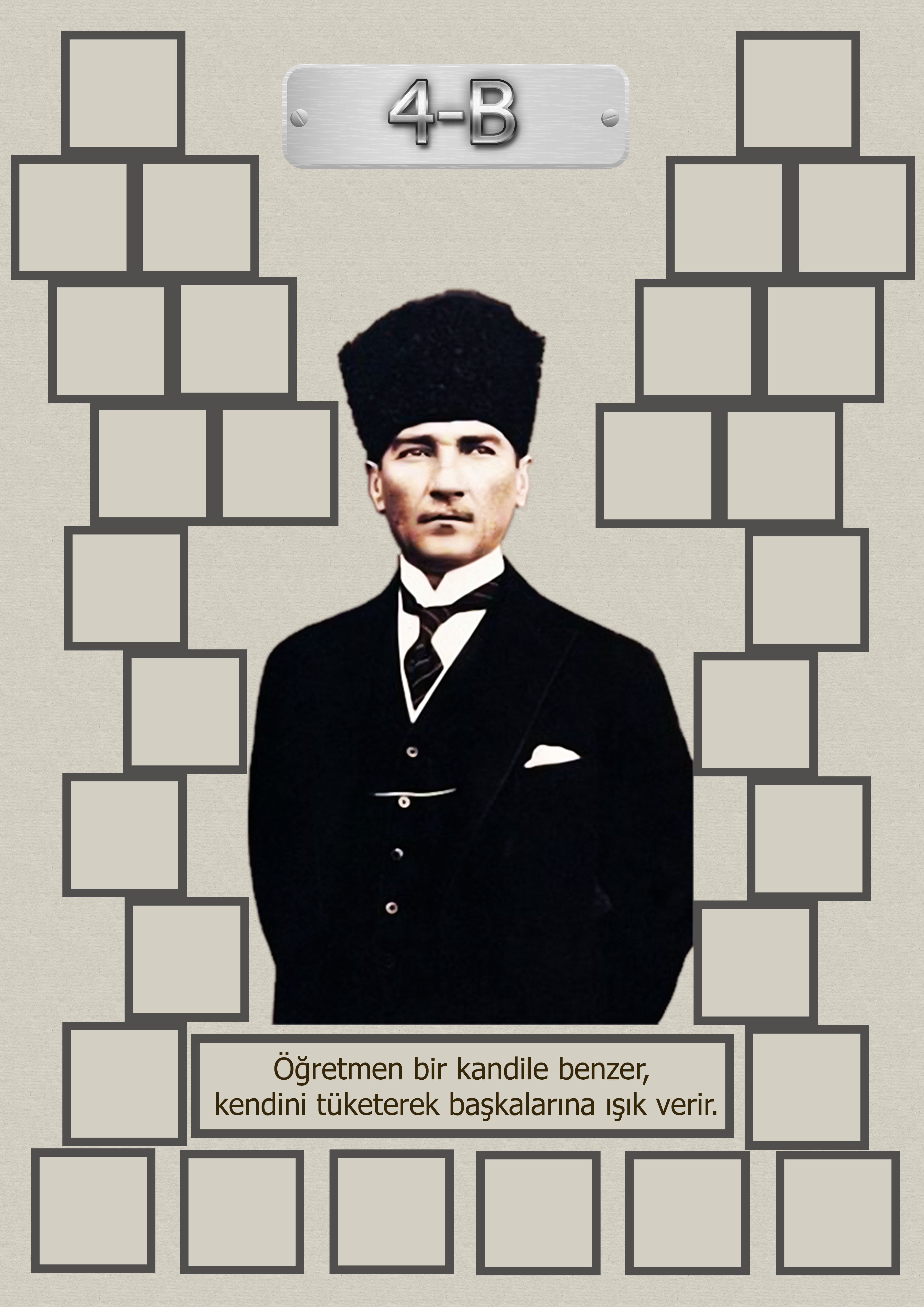 Model 15, 4B şubesi için Atatürk temalı, fotoğraf eklemeli kapı süslemesi - 30 öğrenciliktir. A3 boyutundaki yüksek çözünürlük afiş için dosyayı indiriniz. Kendi öğrenci sayınıza uygun bu model kapı süsü sitemizde yoksa ayrıca istek yapabilirsiniz.