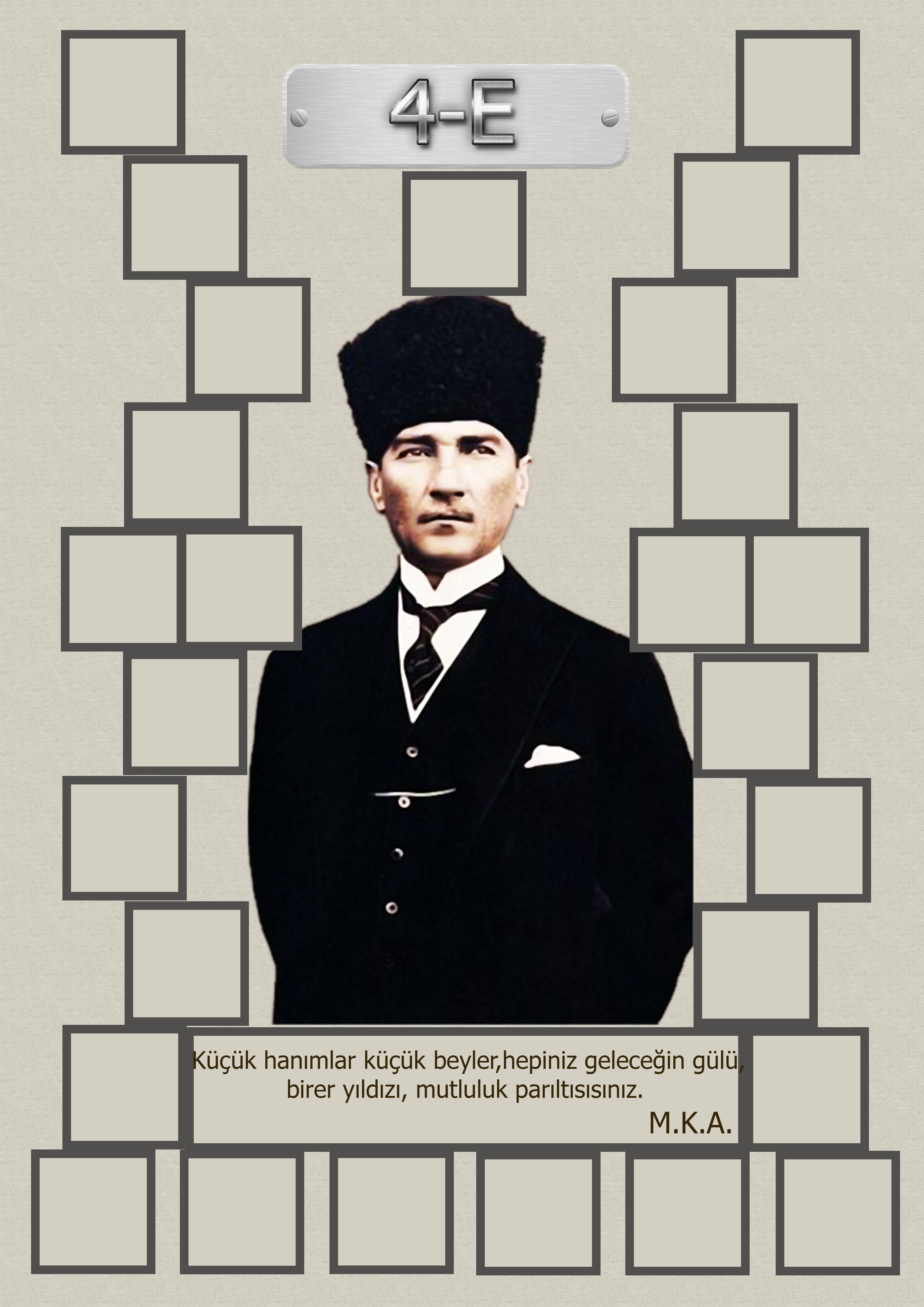 Model 15, 4E şubesi için Atatürk temalı, fotoğraf eklemeli kapı süslemesi - 27 öğrenciliktir. A3 boyutundaki yüksek çözünürlük afiş için dosyayı indiriniz. Kendi öğrenci sayınıza uygun bu model kapı süsü sitemizde yoksa ayrıca istek yapabilirsiniz.