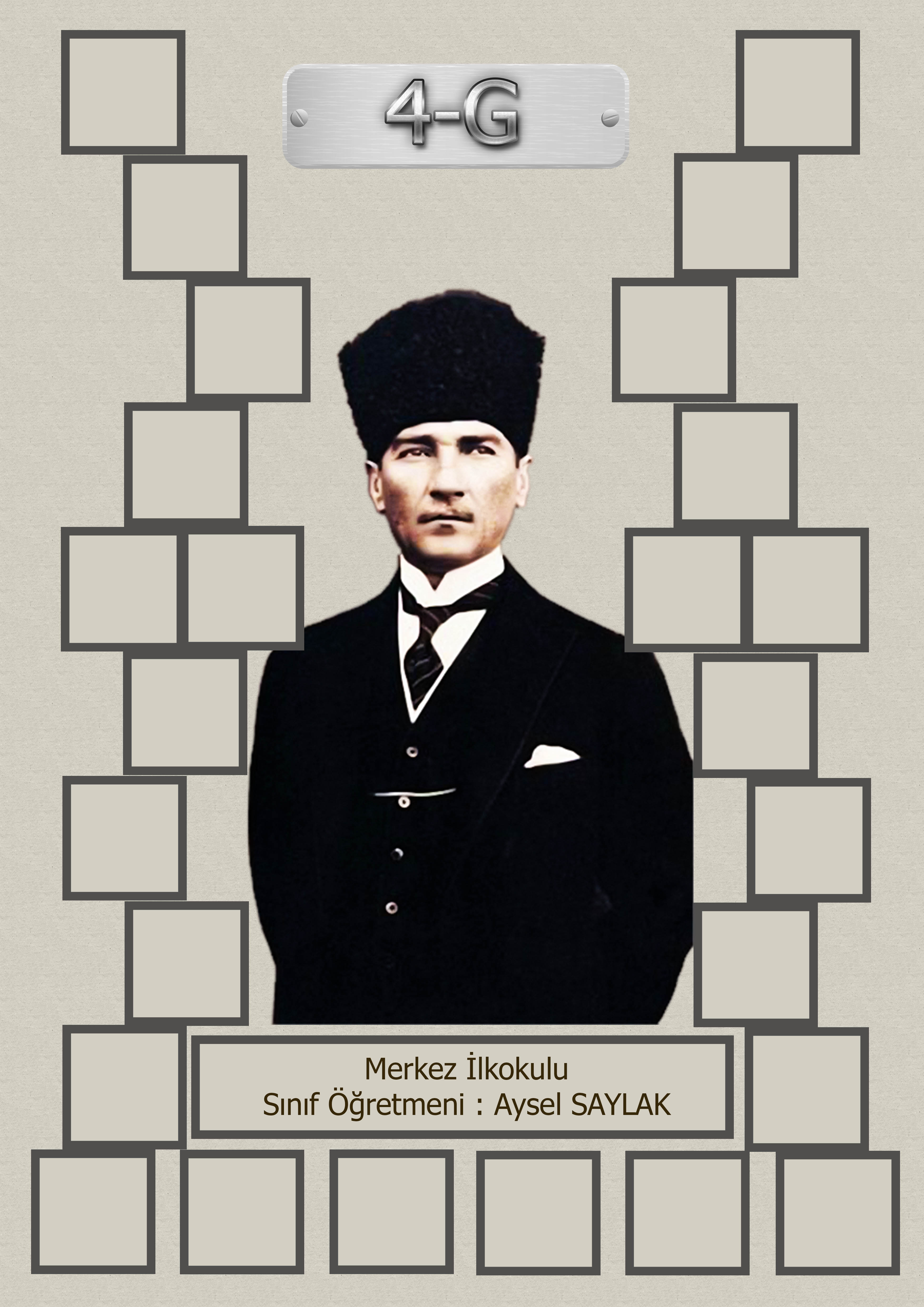 Model 15, 4G şubesi için Atatürk temalı, fotoğraf eklemeli kapı süslemesi - 26 öğrenciliktir. A3 boyutundaki yüksek çözünürlük afiş için dosyayı indiriniz. Kendi öğrenci sayınıza uygun bu model kapı süsü sitemizde yoksa ayrıca istek yapabilirsiniz.