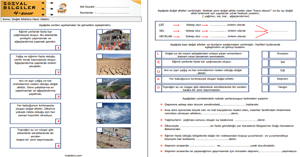4.Sınıf Sosyal Bilgiler Doğal Afetlere Hazır Olalım Etkinliği 1