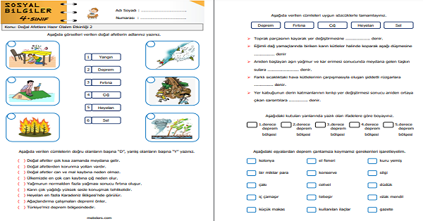 4.Sınıf Sosyal Bilgiler Doğal Afetlere Hazır Olalım Etkinliği 2