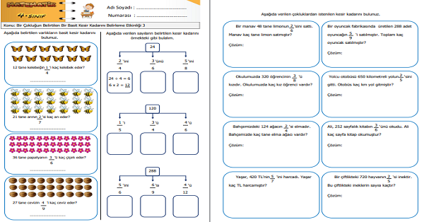 4.Sınıf Matematik Bir Çokluğun Belirtilen Bir Basit Kesir Kadarını Belirleme Etkinliği 3