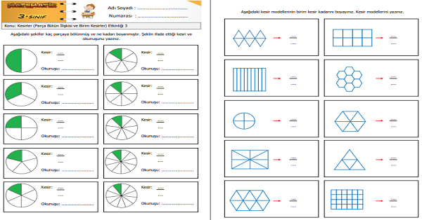 3.Sınıf Matematik Kesirler (Parça Bütün İlişkisi ve Birim Kesirler) Etkinliği 3