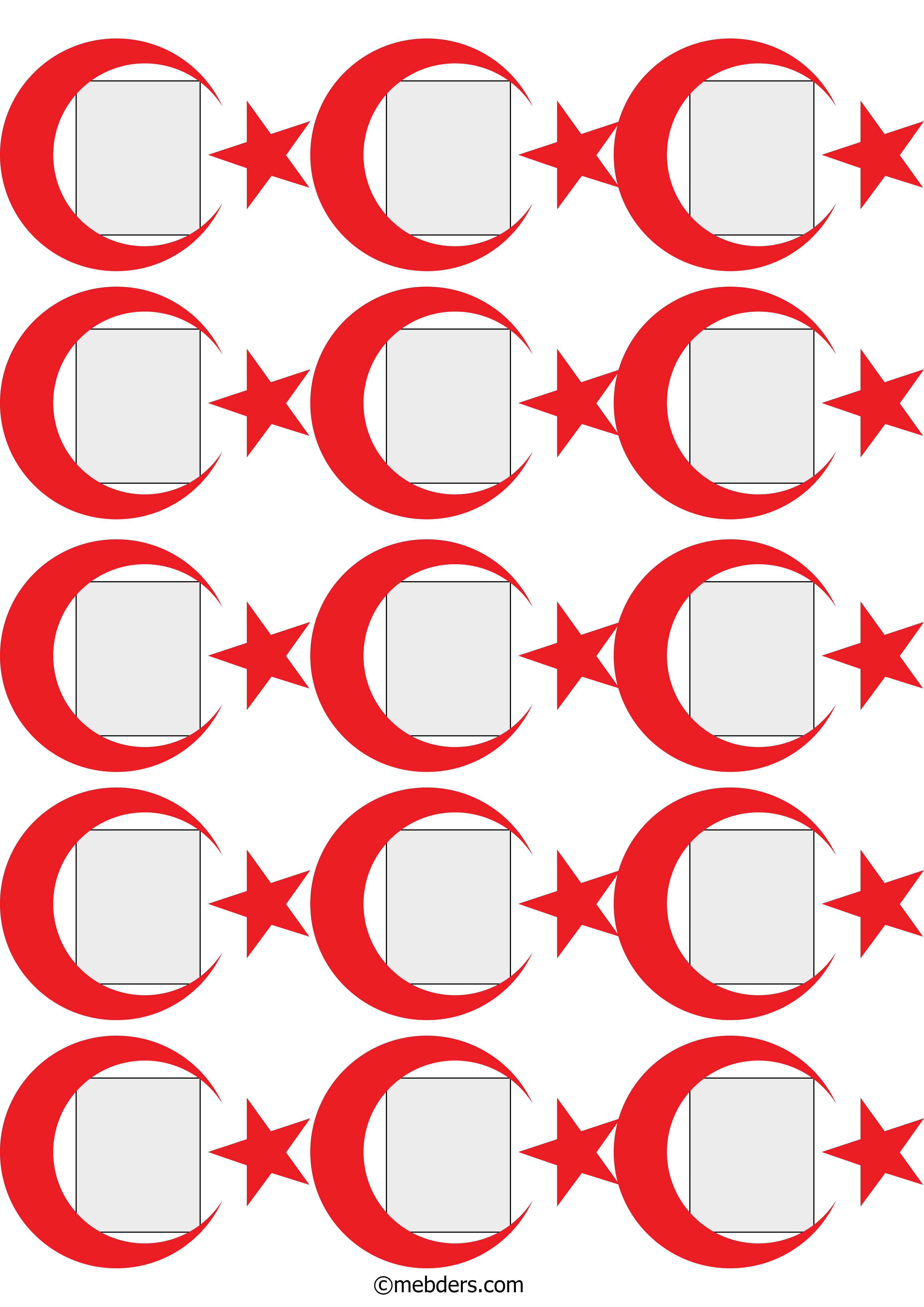 Ay ve yıldız çerçeveli fotoğraf şablonudur. 15 kişiliktir. A3 boyuta göre düzenlenmiştir. A3 çıktı alıp çerçevelere vesikalık fotoğrafları yapıştırabilirsiniz..