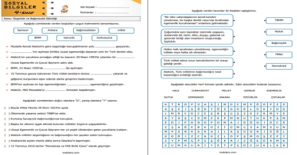 4.Sınıf Sosyal Bilgiler Özgürlük ve Bağımsızlık Etkinliği