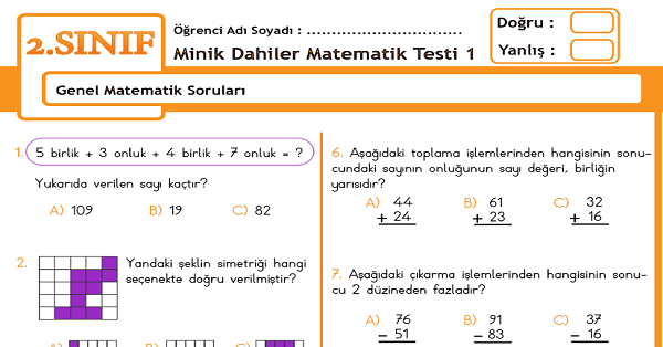 2.Sınıf Minik Dahiler Genel Matematik Testi sitemize eklenmiştir. pdf dosyayı ücretsiz indirebilirsiniz.
